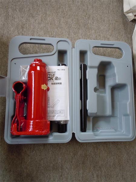 新しく買っておいた、油圧ジャッキで、持ち上げて馬をかませます。![]()