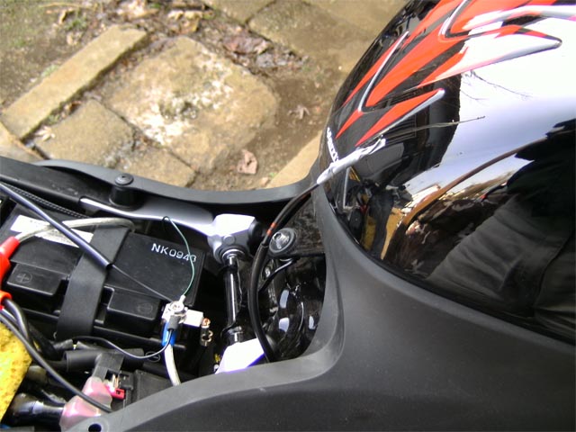 それをシートサイドカウルのビスを外して、ちょっとめくって隙間を通し