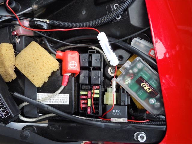 ヒューズ取り出し配線に+側を繋ぎ、バッテリーのマイナス端子に-側を繋ぎ、