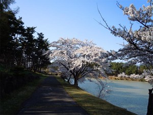 散策の池の回りの道沿いに植えられている桜が満開でとてもきれいです。