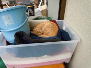 夕方、犬の散歩に行く前に表に出ると、屋根の下のかごの中でプチが寝てました。![]()