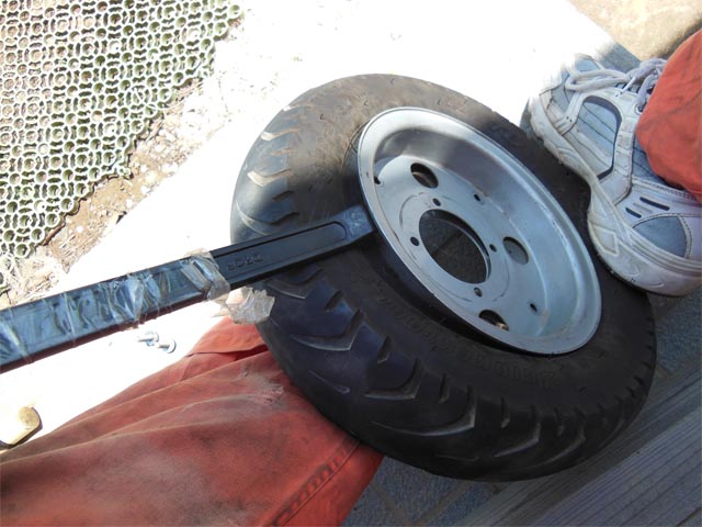 どうせタイヤはいらなくなるんだから切っちゃおうかとも思ったのですが、何だか負けたような気がするので必死に作業しました。