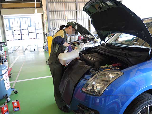 排出口のボルトを閉め、ミッションオイルを挿入口から入れます。