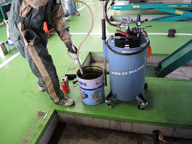 で、手動ポンプをしゅこしゅこやってオイル缶から送って行き、溢れたらOKです。