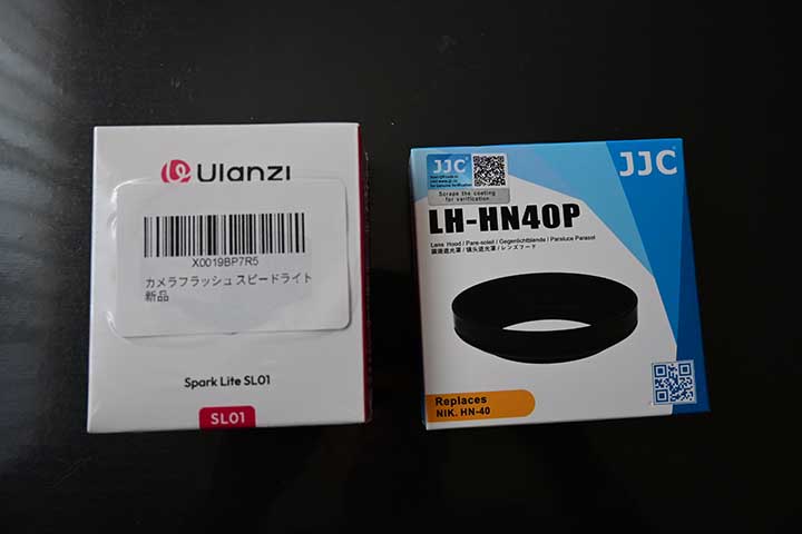中身は超コンパクトフラッシュ(左)とレンズフード(右)。(Z30撮影)