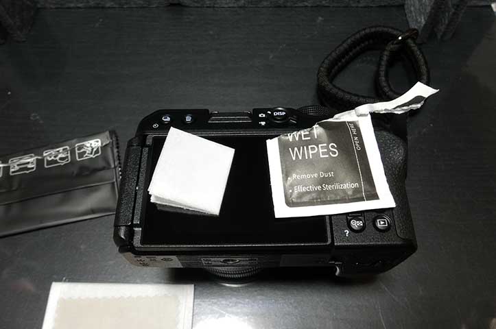 WetWipesを開けて中身のウェットティッシュを取り出し、液晶の表面を清掃します。(EX-100撮影)