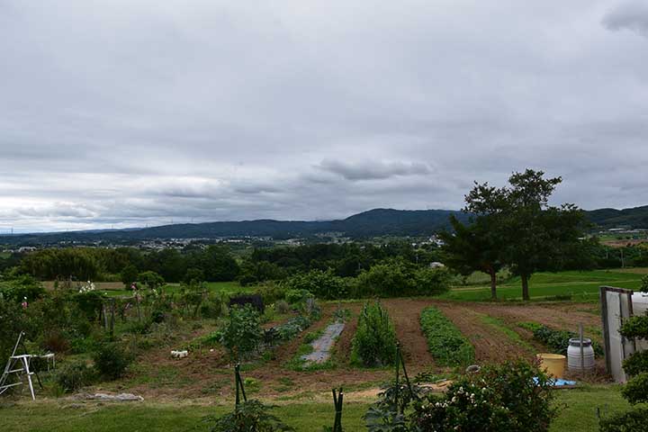 直立して撮ると、丁度目線に物干し竿が来て、山の境を隠してしまうので大股開きスクワットで腰を落として撮ったら、何だか画像がかしがってしまいました。(^^;;;