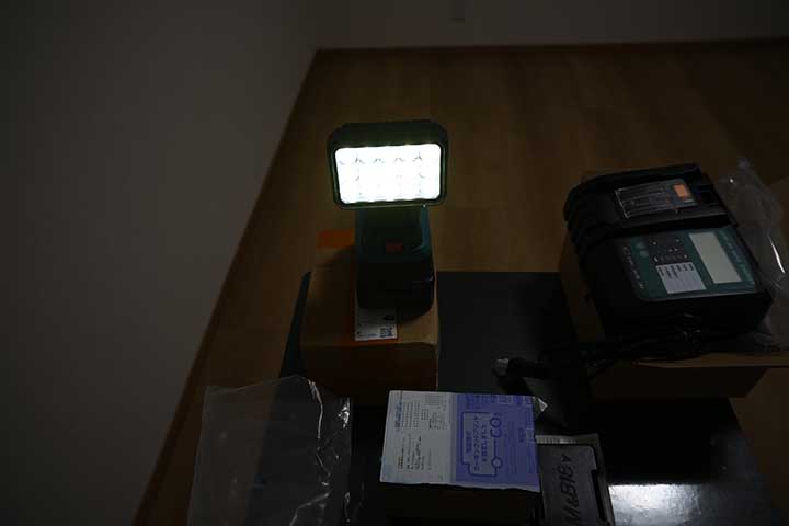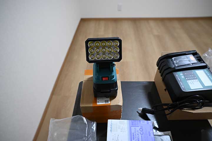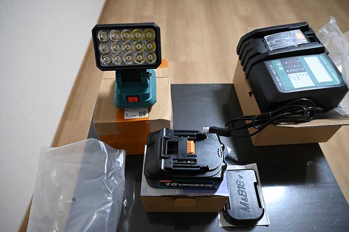 画面の左側がしばらく前に届いていたマキタ互換の18Vバッテリーを電源としたLEDライト。真ん中の下がマキタ互換の18Vバッテリー。(Z30撮影)
