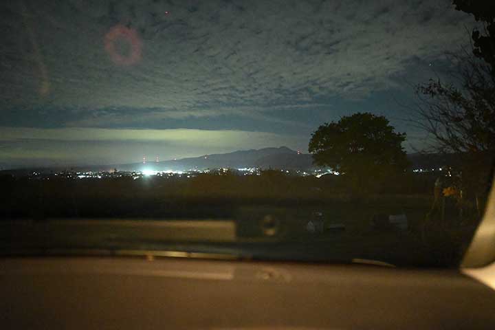 三脚は使っていませんが、エンジンを切っているので振動はなく、ハンドルの上にZ30を置いて撮ったら絞り優先で17.0の解放で撮ったところ、ISOが12800でシャッタースピードが1/1で手振れ防止の効果もあってほぼぶれずにきれいに撮れました。山のシルエットまで写ってます。