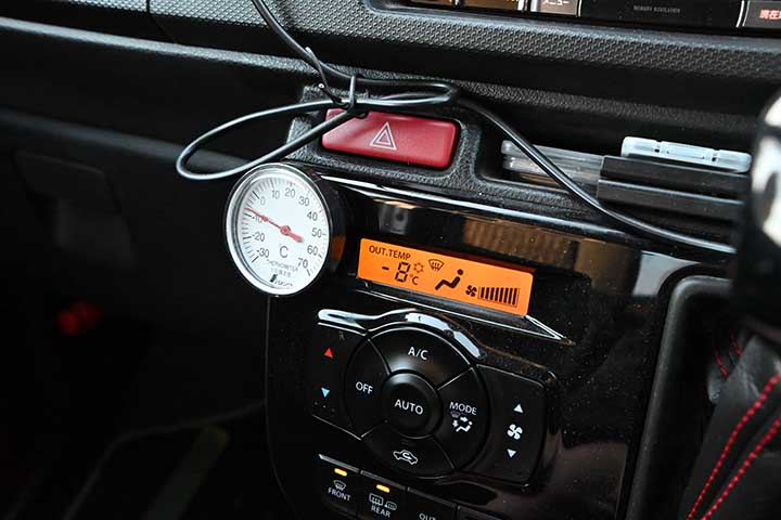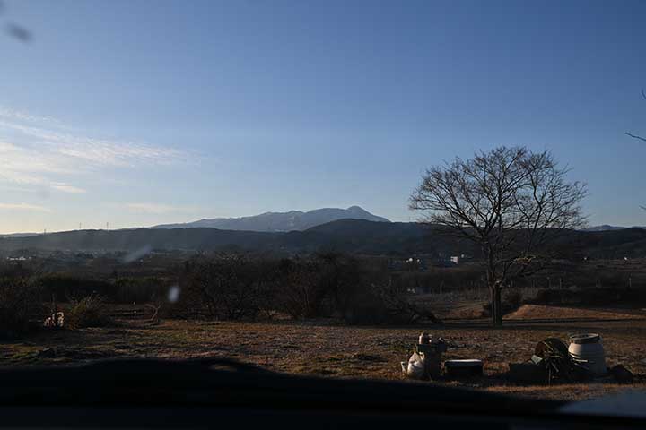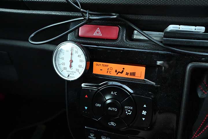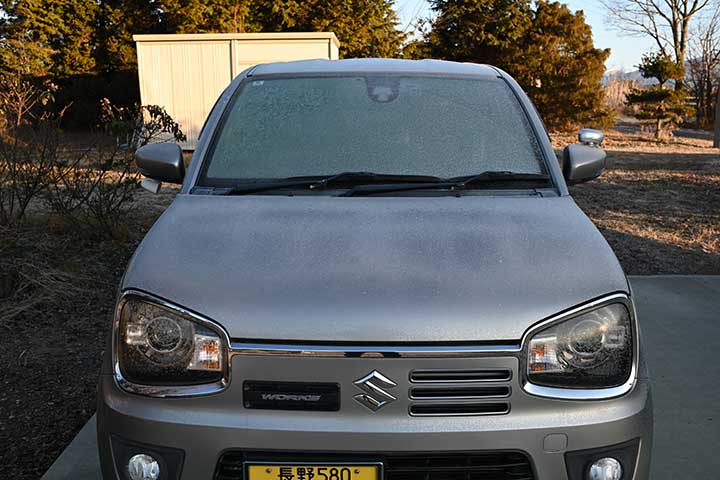 フロントガラスの凍り付きがデフロスターで融けたところから撮影しました。