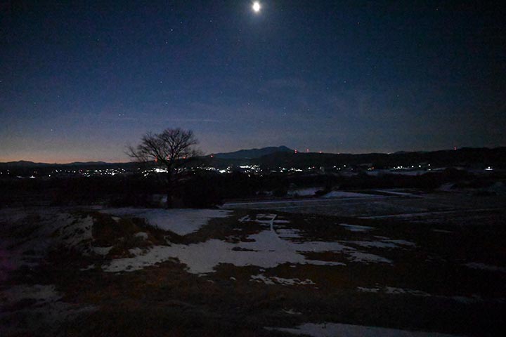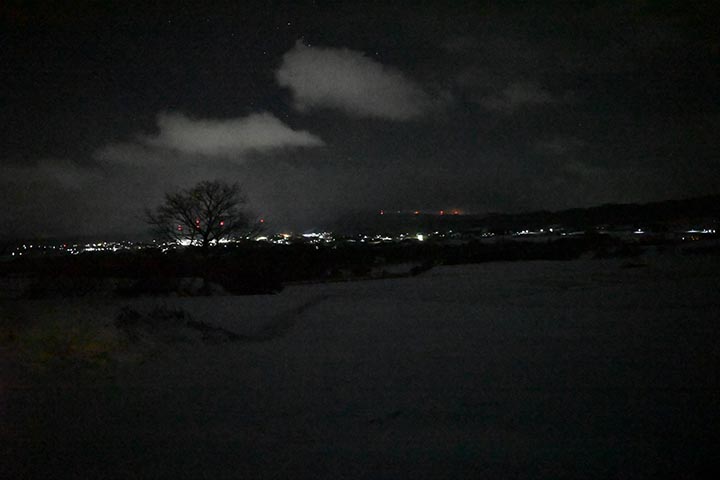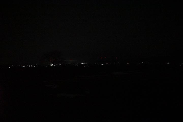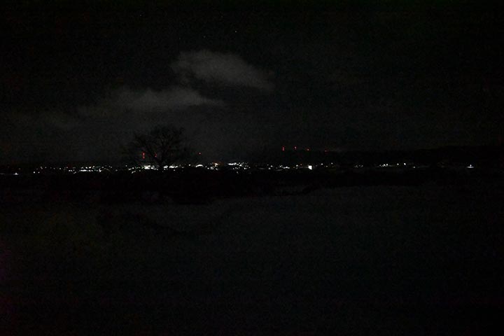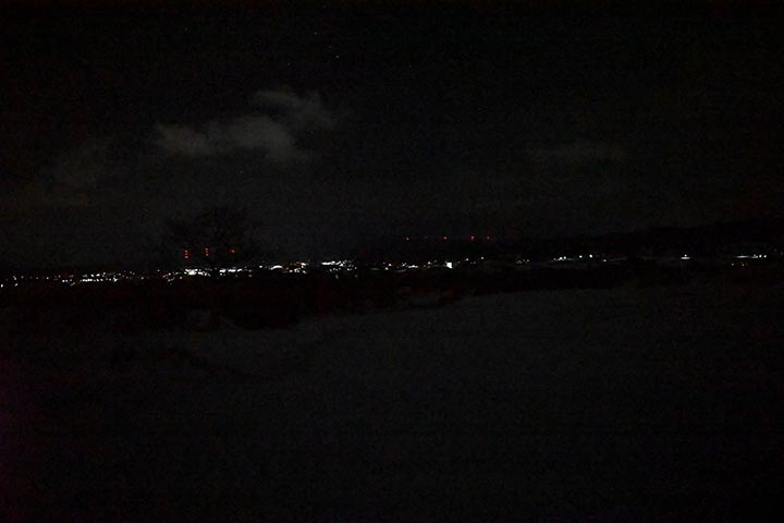 これが現実の明るさなので、取り敢えずISOは25600でもA(絞り優先)モードなら何とか空などの状況は分かりますが、やっぱりノイズでザラザラです。逆にM(マニュアル)モードだと街の点明かりしか分からないうえに空はノイズでザラザラなので、どうせM(マニュアル)モードにするならISOも下げた方がよさそうですね。
